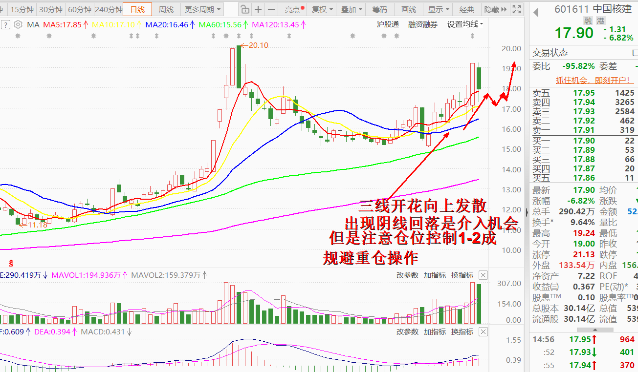 601611 中国核电:公司是全球唯一连续 40 年不间断核电建造企业,业绩与订单(确定性)2026 年 1–2 月新签合同91.09 亿元,营收150.30 亿元,开局稳健。2025年新签合同1484.76 亿元,核电订单占比高,在手订单锁定未来 2–3 年业绩,一句话:中国核建是核电建设绝对龙头,成长逻辑硬得很。周一16 日放量收中阴,高位震荡洗盘,非趋势破位,5日10日均线有强支撑,短线部分资金换筹造成震荡,但不影响中期资金布局信心,在5日-10线整理之后,还有持续冲高机会,业绩优秀股(很多人会看好持有,或是短线买入)所以主力上涨过程中必然有大震荡进二退一,洗掉浮筹。你拿的是核电建设全球龙头,不是题材股,业绩与订单是最硬的盾牌。所以不用惧怕主力砸盘洗盘。