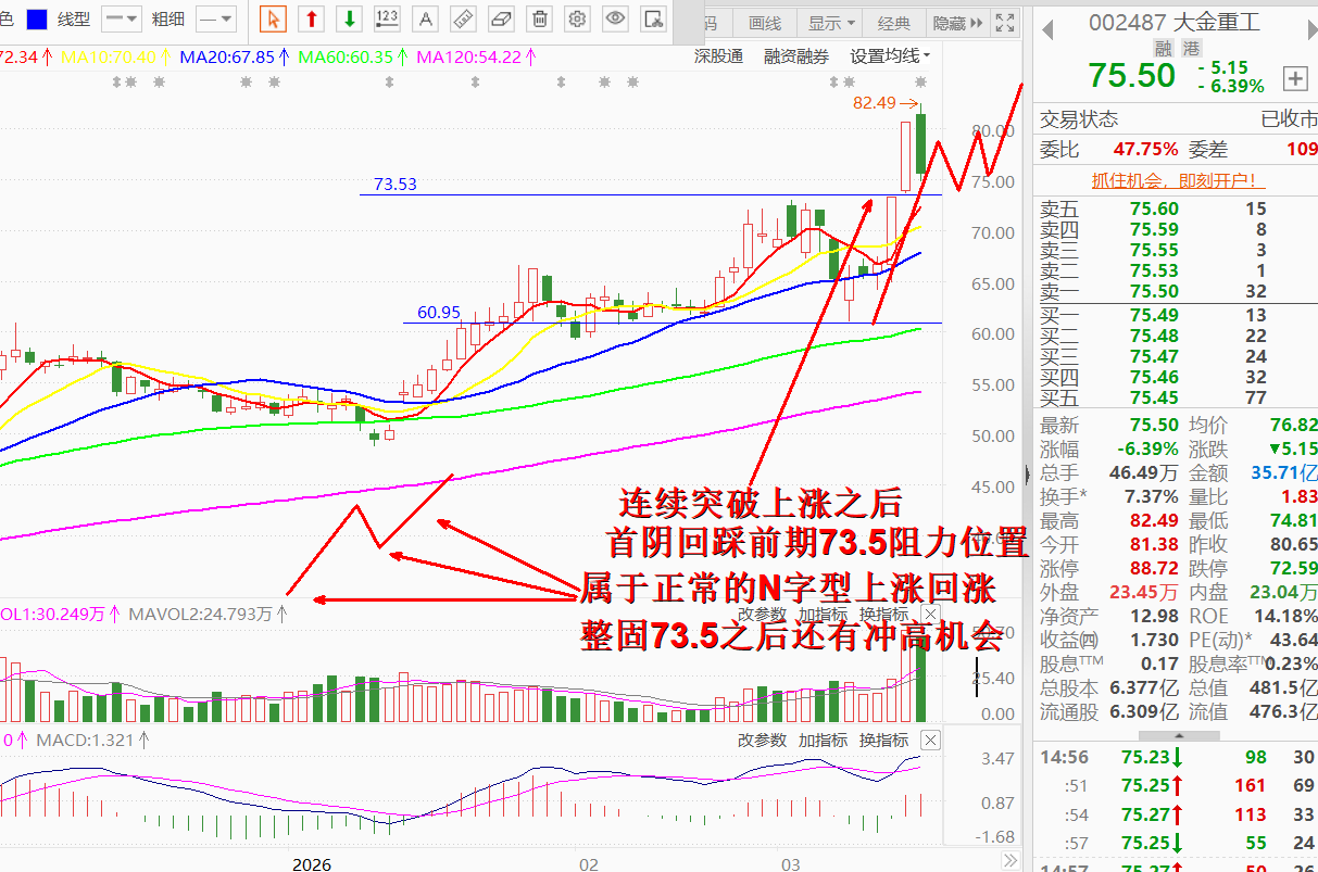 002487 大金重工:全球海风装备龙头海外在手订单超 100 亿元,欧洲需求爆发。全球海风加速,业绩炸裂:2025 年净利润11.03 亿元,同比增132.82%,上市以来最好成绩。一句话,业绩、订单、赛道全是加分项。周一K线高位震荡洗盘,连续涨停后首次大回调,属于突破后的正常回踩。股价上方无历史套牢盘。均线系统多头排列,强势股都会有大震荡,洗掉浮筹才能走更远。你拿的是业绩,赛道,资金三重共振的龙头,不是垃圾股。只要基本面不变,主力不走,坚定持有,稳住心态,好股票不怕震荡,怕拿不住。