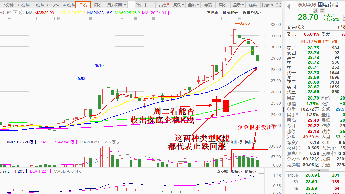 600406 国电南瑞:电网绝对龙头,技术壁垒无人能及。新型电力系统、特高压、储能、AI 算电协同。未来3-5年业绩高增确定性极强,现金流强劲。抗周期、抗风险能力A 股顶级。周一日K 线形态(缩量回踩,中期趋势完好)今日关注20日线强支撑附近能否收出止跌探底K线,或是小阳看涨K线。