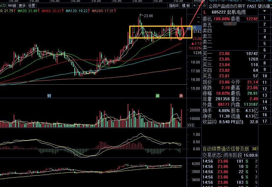 (605222)起帆电缆: 起帆电缆前期的走势属于非常典型的趋势推进行情。资金沿着5日线和10日线不断抬高股价,这种走势往往意味着主力资金是在做中期趋势,而不是短线炒作。目前股价来到前期高点附近,开始出现横盘震荡。从技术结构来看,这种平台更像是上涨途中的整理阶段。主力通常会在这个阶段通过震荡的方式完成筹码交换。如果后面成交量开始放大,并且突破平台压力,那么股价有可能会进入新的上涨阶段。