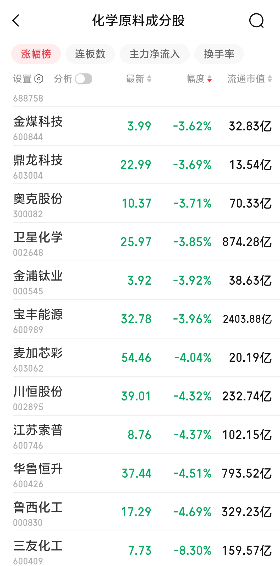 4.看今天化学原料总览,三友倒数第一,离差倒数第二3.5个百分点,明显脱离化学原料成分股