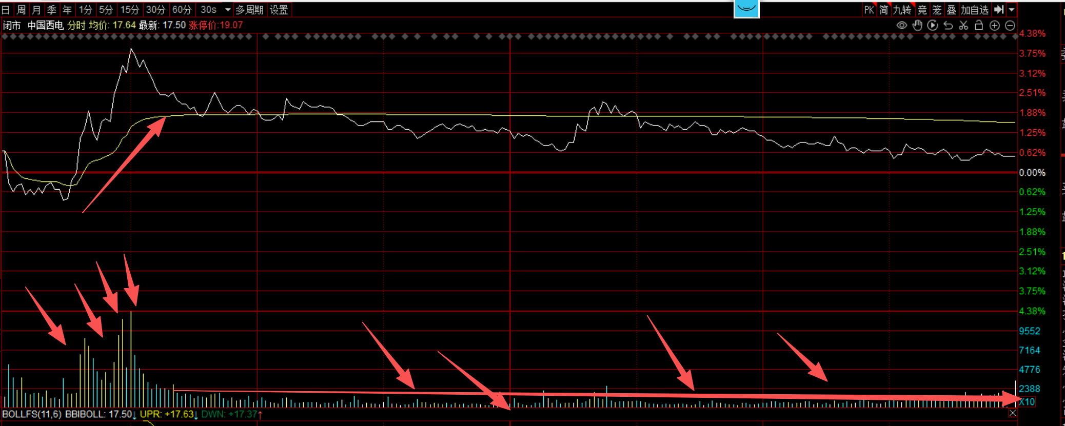 中国西电高开打到水下震仓,9点40之后就开始万手有大买单吃进,很疯狂4笔8万手两笔10万手大单买进,股价快速上涨4%。技术上出现阳包阴,明显是朱莉在回补仓位了,到这里我认为都是正常的,毕竟电网方向是有4万有投资做为背书的,逻辑清晰,产业资本不应该会放弃。但10点之后后续力量没有跟上,一路震荡回调,回吐全部涨幅。这里有朋友认为是朱莉拉升诱多,我倒是觉得是被大金融给带沟里面去了,今天是放量了,没有翻绿,就代表朱莉资金开始反击,我是没有动,连高抛低吸都没有做,今天要不是大金融捣乱我它至是5个点以上的大阳线。成交全部集中在早盘10点之前,10点之后就是自由回落,不是朱莉卖出的主动回调。