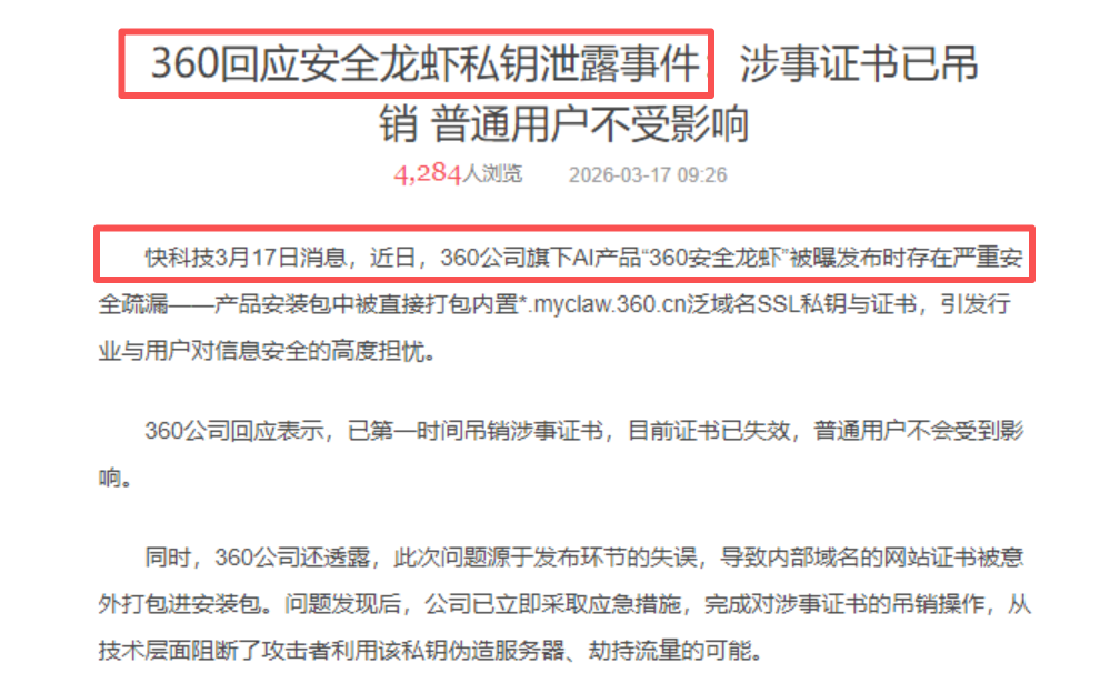 360开盘也是 遇到集中万手大卖单一路震荡走低,近期蹭龙虾热度蹭到马屁股上了,发布的360龙虾安全卫士私钥泄露,搞得是什么事嘛,什么热度都要蹭,大模型做得跟一样,每一次科技风口都快速跟进,产品也不怎么样,太让我失望了活该今天大跌4%,本来指望它扛起网络安全大旗,结构还是一样拉胯,刚回本两天又把我给套进去了,真是烂泥扶不上墙。