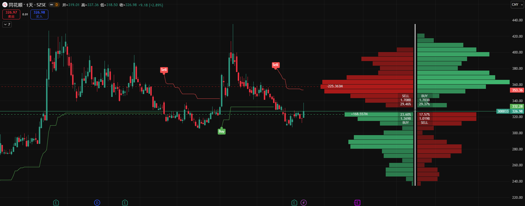 中继筹码博弈: 4 小时图显示,在 320.00 - 335.00 元附近新积累了约 +84.934M 的换手筹码。今日的放量拉升说明该区域的买盘力量已占据主动。