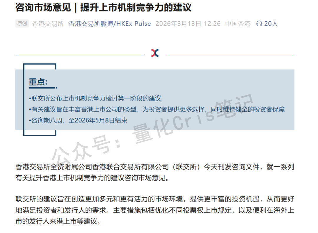 港交所于2026年3月13日发布了【上市机制竞争力检讨的第一阶段咨询文件】,该咨询将持续至5月8日。
