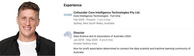 他曾联合创立Core Intelligence Technologies,并担任澳大利亚数据科学与AI协会的主管。