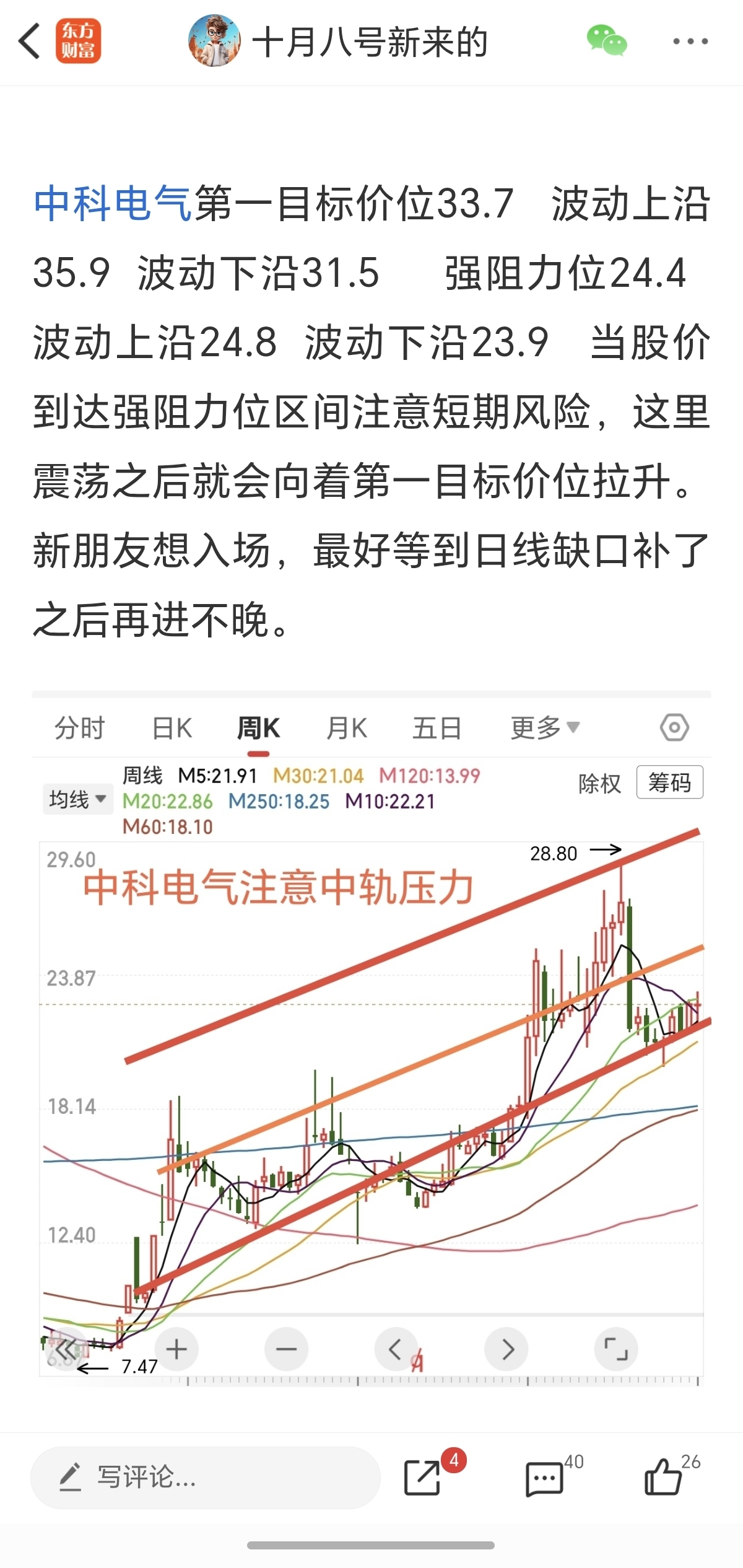 中科电气我是在1月18日第一次分析,下面是当时分析原文(第一目标价位33.7 波动上沿35.9 波动下沿31.5 强阻力位24.4 波动上沿24.8 波动下沿23.9 当股价到达强阻力位区间注意短期风险,这里震荡之后就会向着第一目标价位拉升。新朋友想入场,最好等到日线缺口补了之后再进不晚。)近期最高价24.24 之后的回落就是因为触及到了到了强阻力价位24.4 区间 这里震荡之后我认为将再次上行,但由于近期中东黑天鹅事件扰动产生非理性波动 中科电气结构发生了微小改变,原第一目标价位更改为30.73 波动上沿32.57 波动下沿28.89 从最新趋势图可以观察到,中科电气依然没有回归到红色趋势线的波动下沿之上,所以再耐心等待一下,等待大盘情绪恢复!