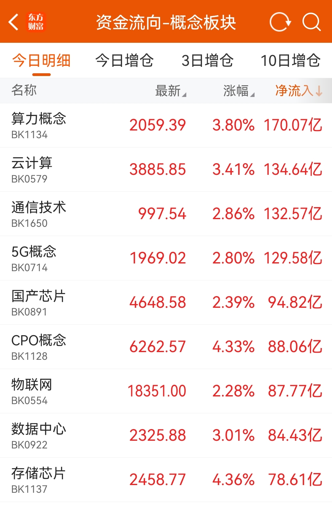 板块涨跌幅方面,算力概念涨幅居前,平治信息20cm涨停,数据港、顺灏股份、瑞斯康达等多股涨停;存储芯片板块回升,同有科技、西测测试、深科达均20cm涨停;CPO概念震荡走高,新易盛涨超10%,中贝通信、可川科技等多股涨停;