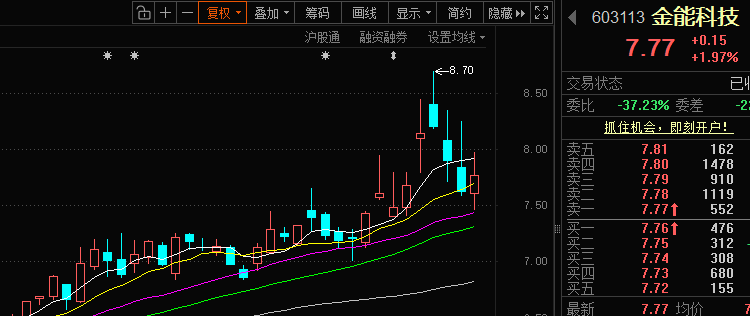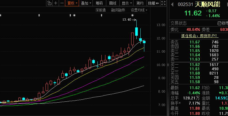 天顺风能也是在高位回落连续的大跌今日回踩10日线收回10日线上方,资金有止跌的迹象明天要是有阳线拉升就说明调整到位了,反而没在场内的朋友可以小仓位博弈一下这个短线修复的利润。
