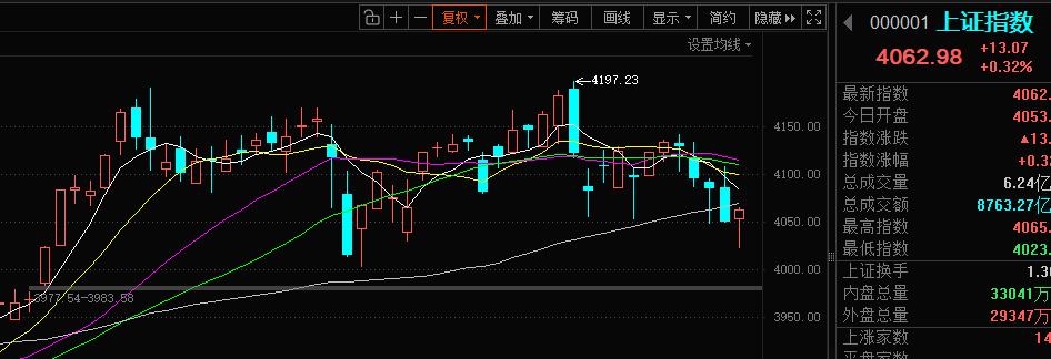 今日A股三大指数集体上涨,截止收盘,沪指涨0.32%,收报4062点;深证成指涨1.05%,收报14187点;创业板指涨2.02%,收报3346点。成交额2.06万亿,较昨日缩量1635亿。