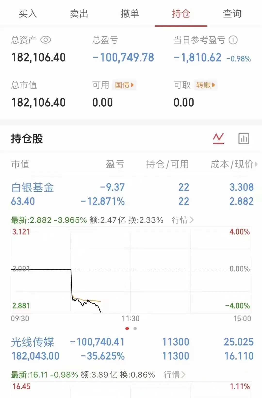 谁料风云突变。2月24日,春节后开年首日,院线板块全线崩盘,光线传媒大幅低开,直接跌破他的成本价。开盘后不久,股价一路跳水,20%跌停封死在21.78元。一天之内,他不仅回吐全部盈利,还瞬间产生3.65万元亏损,彻底被套牢。