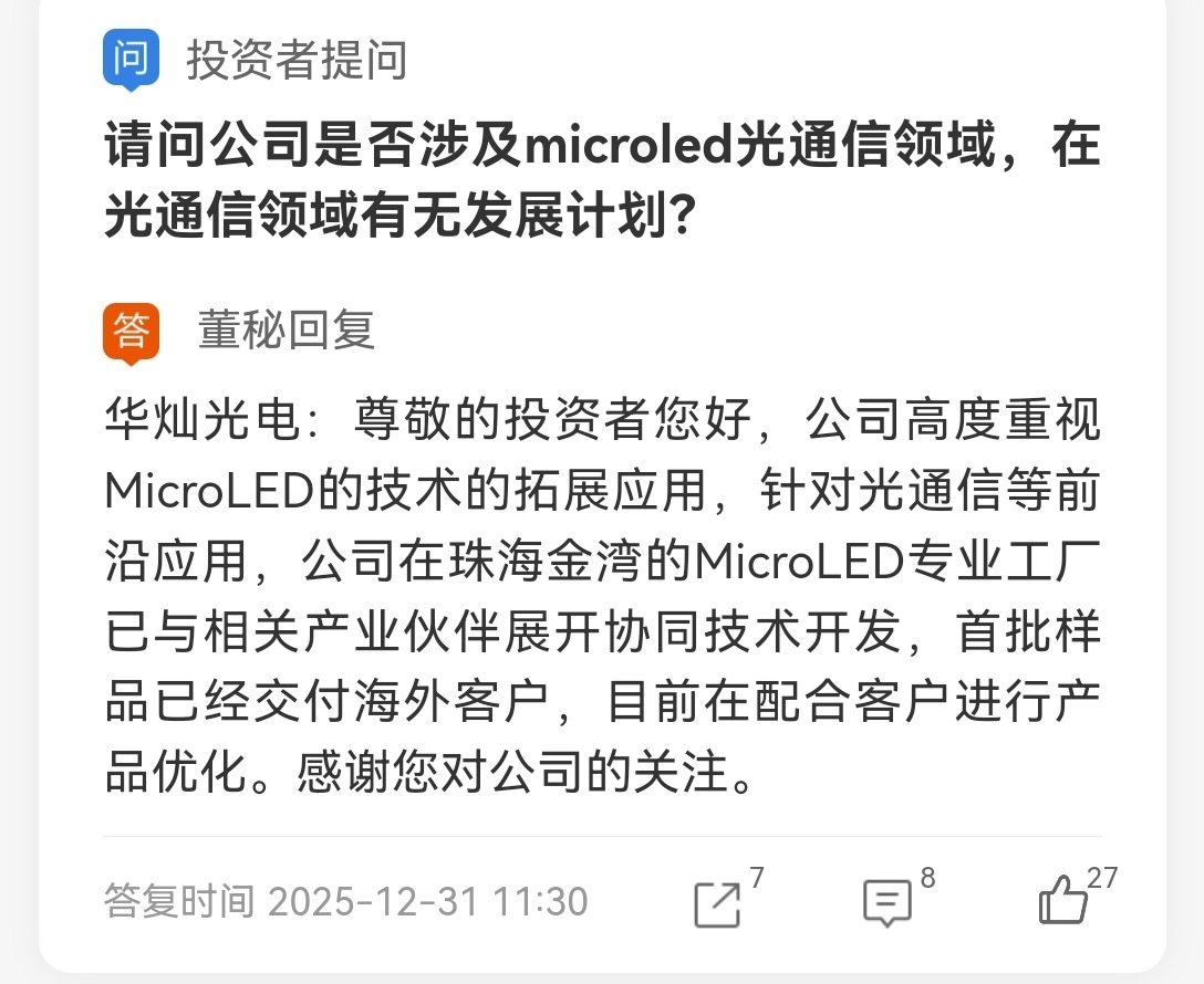$华灿光电(SZ300323)$ 是 全球少数实现 Micro LED 光通信样品量产并送样海外客户的企业,其技术被市场视为 CPO 短距光互连的理想光源替代方案。