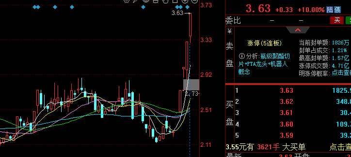 连续五天涨停,收盘3块6毛3,成为市场最高标。流通盘近39亿股,能顶出五连板说明资金认可度高。但连续涨停后获利盘堆积,今天得盯紧开盘承接。化工板块情绪如果延续,它还有表现空间;一旦分歧加大,获利盘兑现压力不小。手里有的设好止盈,没进的别追了。