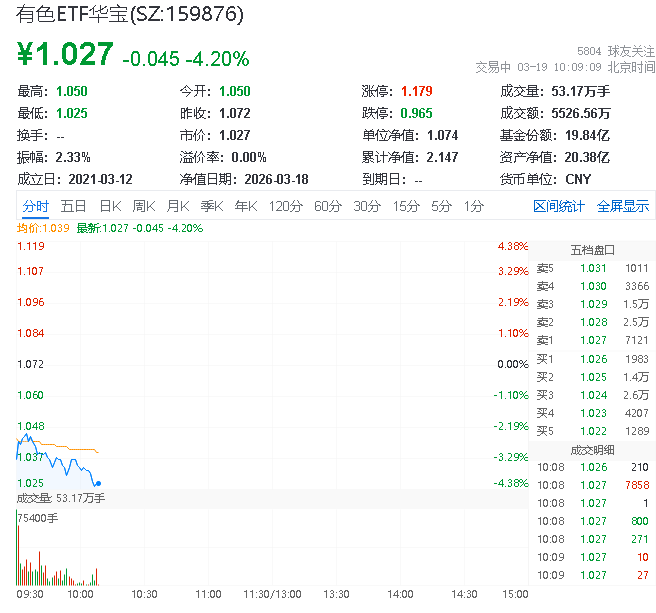 热门ETF方面,有色ETF华宝(159876)场内价格下跌4.2%,成交额达5362.92万元。