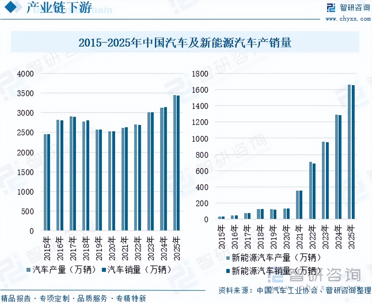 与全球汽车行业发展情况相似,我国汽车行业在经历本世纪初的10年高速发展后也进入稳定增长期。根据中国汽车工业协会公布的中国汽车产销量数据,2025年,我国汽车产销量分别为3453.1万辆和3440万辆,同比分别增长10.4%和9.4%,连续17年稳居世界第一,保持增长趋势。2020年10月国务院办公厅发布的《关于印发新能源汽车产业发展规划(2021—2035年)》中指出,发展新能源汽车是我国从汽车大国迈向汽车强国的必由之路,也是应对气候变化、推动绿色发展的战略举措。顺势而为、乘势而上,我国政府因时制宜地出台一系列政策红利持续刺激我国新能源汽车向好发展。近年来,我国新能源汽车快速发展,数据显示,2025年中国新能源汽车产销量分别为1662.6万辆和1649万辆,同比分别增长29%和28.2%。在政策的推动下,新能源汽车渗透率不断提升,2025年国内新能源汽车渗透率达到47.94%。汽车产销量稳步增长,特别是新能源汽车的快速发展,为汽车模具行业提供了持续扩大的市场需求。