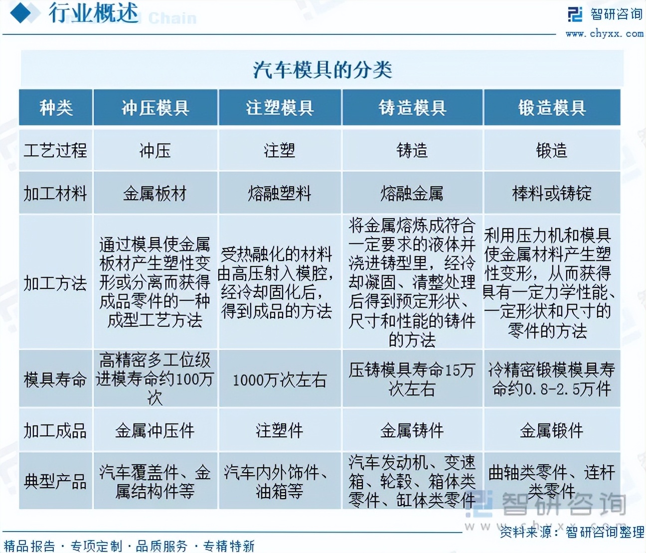 由智研咨询专家团队精心编制的《中国汽车模具行业市场需求分析及投资策略研究报告》(以下简称《报告》)重磅发布,《报告》旨在从国家经济及产业发展的战略入手,分析汽车模具行业未来的市场走向,挖掘汽车模具行业的发展潜力,预测汽车模具行业的发展前景,助力汽车模具行业的高质量发展。