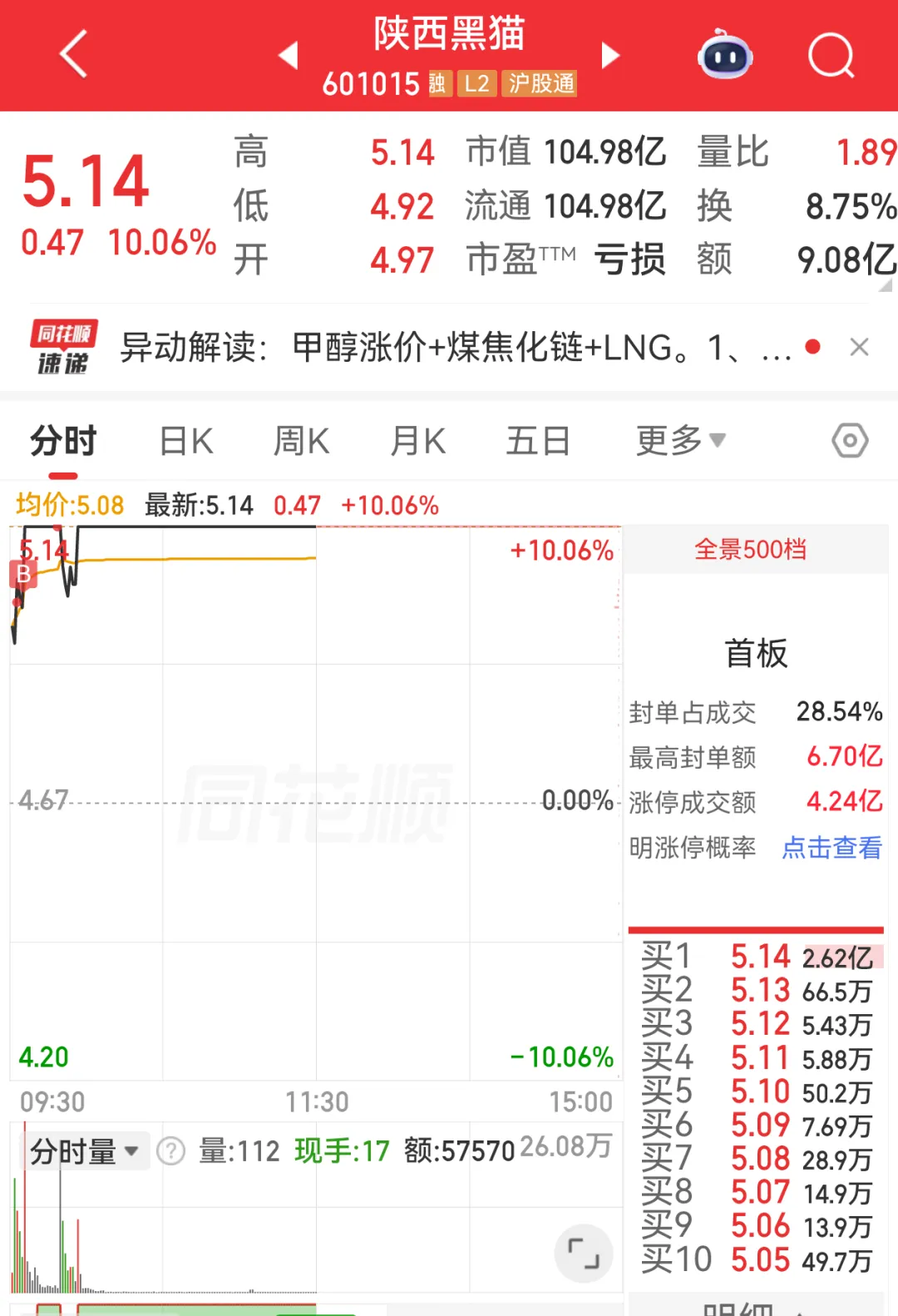 1、陕西黑猫,早盘煤炭兴化股份一字板涨停,半路7个点一笔,板上加了一笔;