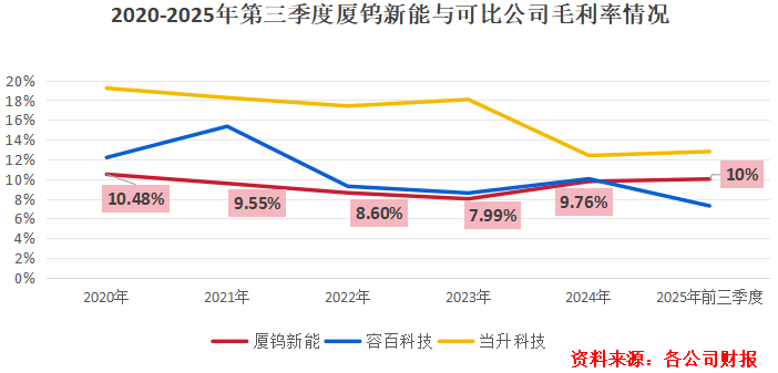 2020年以来,厦钨新能毛利率小幅下降后,在2025年前三季度又回升到10%,总体较为平稳,超过荣百科技,与当升科技的差距也在逐渐缩小。