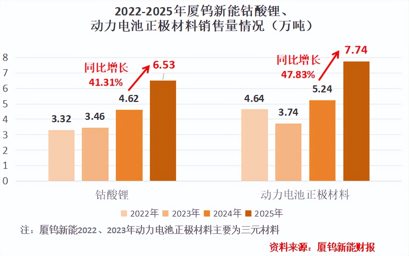 2025年全年,公司动力电池正极材料(包括三元材料、磷酸铁锂及其他)整体销量为7.74万吨,仅钴酸锂的单一销量就有6.53万吨。两类材料销售量均实现同比大幅增长,共同助推公司2025年业绩大增。