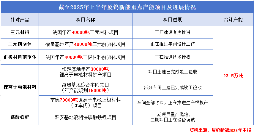 厦钨新能在三元材料、正极材料等方面加快产能布局,截至2025年上半年,公司国内外产能项目有序推进,合计产能高达23.5万吨。