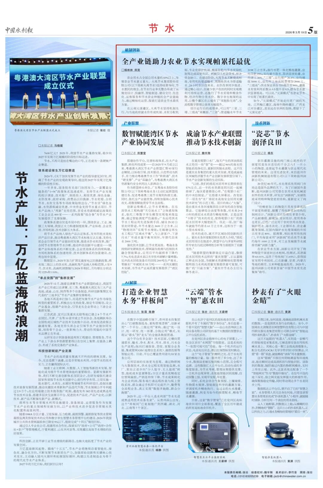 今日(3月19日)刊发的《中国水利报》,在第五版顶部“机制创新”专栏,专题报道大禹集团《全产业链助力农业节水实现帕累托最优》的相关模式案例。文章指出,大禹集团发挥全产业链优势,依托精细化运营,探索打造农业节水最优方案。