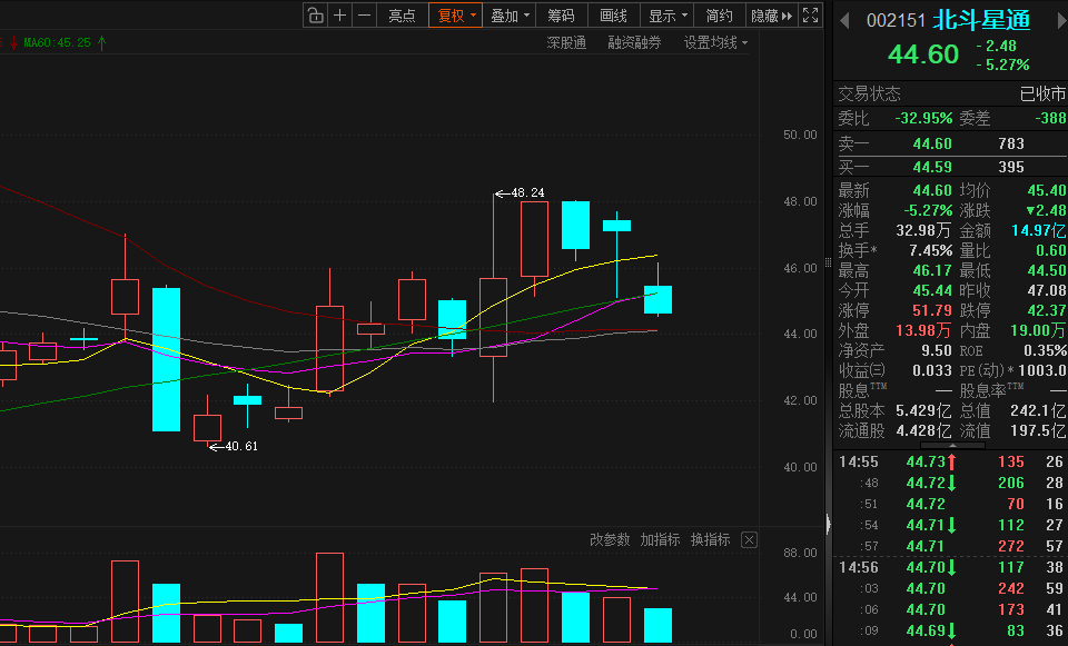 短期来看关键位置跌破,大伙跑得也挺凶,加上大盘不给力,接下来大概率是要进入震荡磨底的阶段,先把这波套牢盘和获利盘消化一下。还在场的战友别慌,盯紧44块这个位置。能守住,就再观察一下。要是放量跌破44,那就别犹豫,该减仓减仓,先出来看看。下面更深的支撑在41.95。3月底到4月卫星这块有密集发射窗口,产业催化还在,这可能是后面行情的导火索,可以当个中长期观察点。