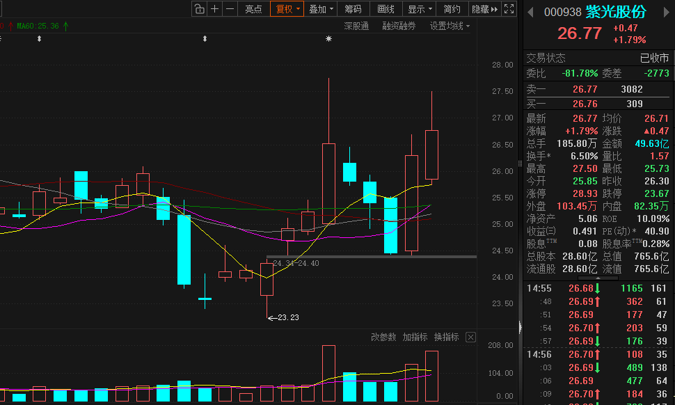 纯正算力龙头。算力网络设备、高速光模块、液冷系统这些全是当下AI基建最缺的货。现在国内智算中心到处开工,高端算力设备、高速光模块需求爆棚,行业红利肉眼可见,公司作为头部玩家,订单和业绩都有保障。站在风口上,而且手里有真家伙。今天要是低开5日线附近可以找机会分仓低吸。再者就是昨天的收盘价26.77,这个位置稳住也是不错的分批上车点!不到位置就别动!!!喜欢一撮而就的战友还是先观战,别瞎搞。