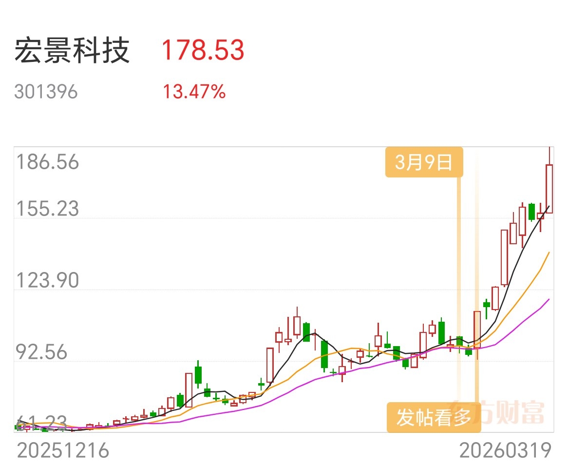 今天周五,回归三月以来,已过去三个周,一直围绕算力、电力、化工,这三个板块死拿不放,算力板块的宏景科技,从突破启动的93元,3月9日专贴提示: