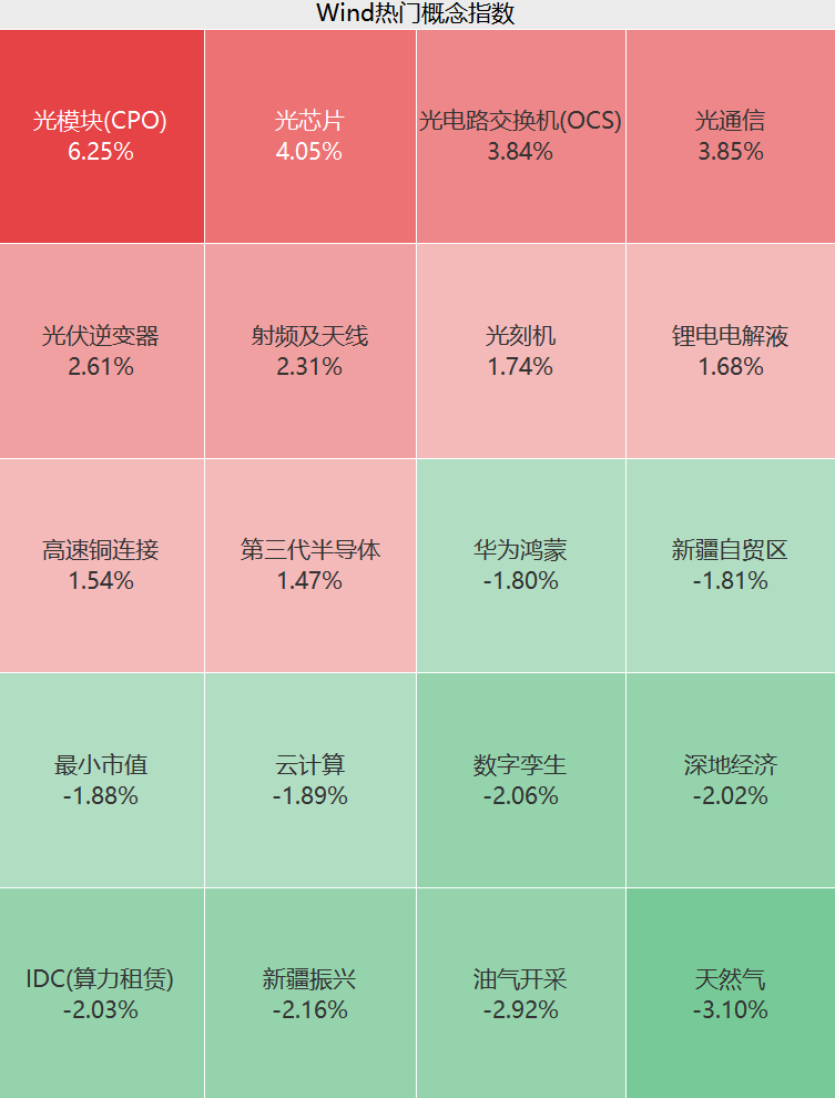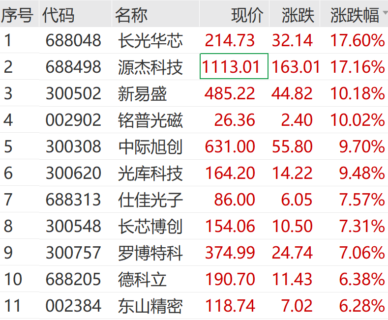 个股方面,铭普光磁2连板,长光华芯涨超17%,中际旭创、新易盛、德科立等纷纷大涨。