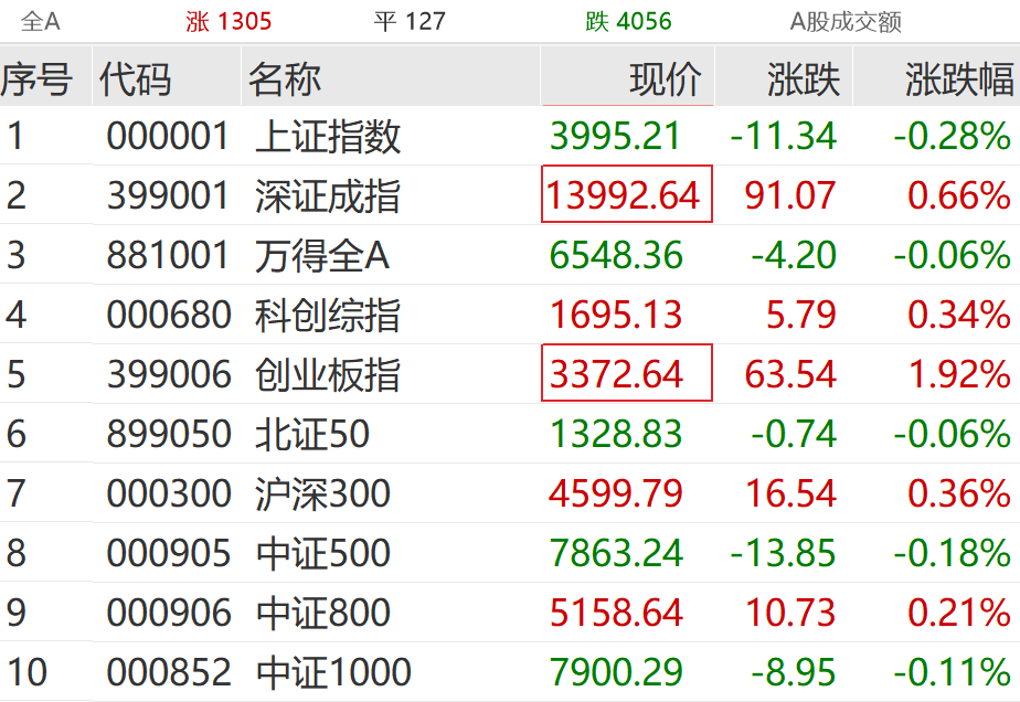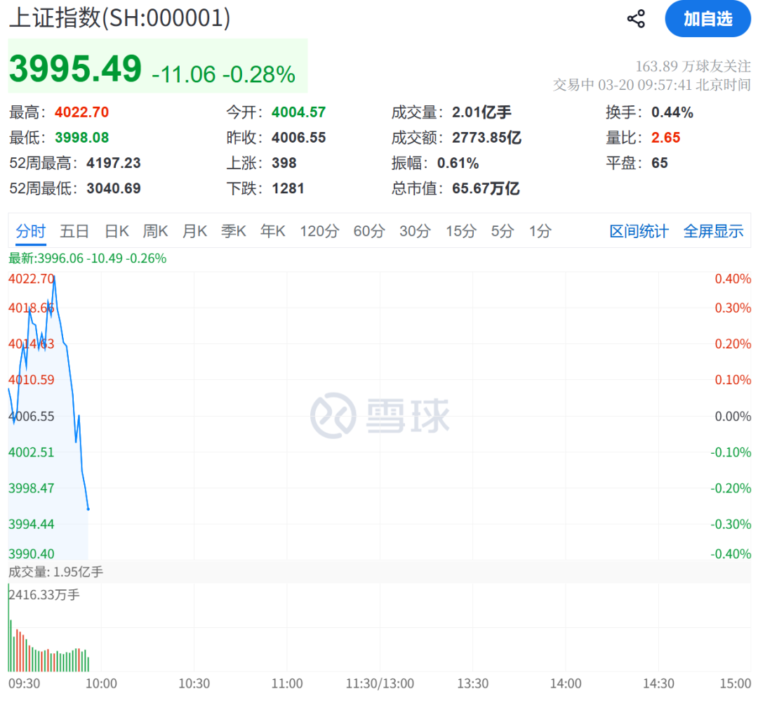 3月20日,A股主要指数开盘分化:上证指数微跌0.05%,深证成指涨0.86%,创业板指涨1.6%,科创综指涨0.54%。盘初市场冲高回落,截至发稿,上证指数飘绿,超4000只个股下跌。