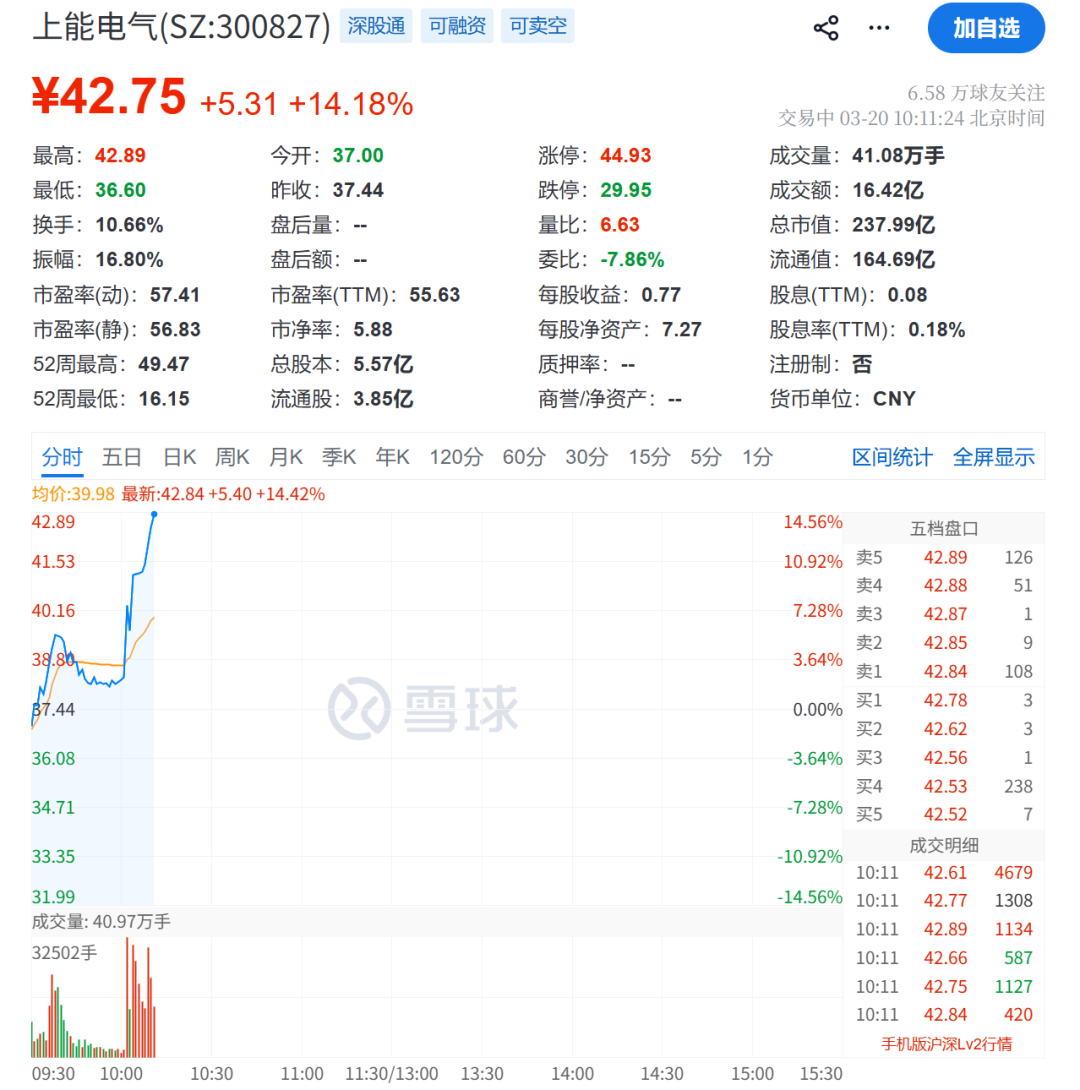 上能电气盘中直线拉升,涨超14%。