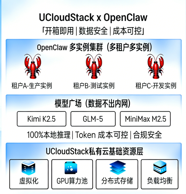 企业用大模型,真正产生价值的地方在于结合自身的业务数据。这就要求底层架构必须能兜住安全底线。 采用私有化部署加本地推理的方式,意味着所有的模型推理、文档解析和对话记录,全部留存在企业的内网虚拟机上。这种物理层和网络层的双重隔离,从源头上切断了核心数据向公网流出的可能,能够顺利通过企业内部的安全合规审计。 在确保了安全的大前提后,内部部署的OpenClaw可以通过专线或内部VPC,放心地对接ERP、OA、CRM等核心业务系统。AI能够安全地读取这些内部知识库,变成真正懂企业自身业务的得力助手,盘活沉淀的数据资产。 要让AI真正成为日常生产力工具,算力部署的转变很关键。 按Token调用外部大模型属于持续的变动运营支出,总有种“烧钱”的焦虑感。而通过本地化部署开源大模型,则是把这笔Token开销转化为对底层算力硬件的固定投入。 只要硬件资源就位,后续内部员工产生的高并发对话、长文档处理等操作,都不再产生额外的外部调用费。这种模式让IT和财务部门能够清晰地测算和管控成本,不再因为每天浮动的API账单而头疼,让企业实现“Token 自由”。 UCloudStack私有云平台提供了一个安全、务实的支撑环境。 通过底层成熟的虚拟机级隔离技术和简便的镜像管理机制,帮助企业绕开了复杂的底层搭建工作,同时实现沙箱安全隔离。依托UCloudStack作为私有云底座,企业可以低门槛、更安全地完成OpenClaw等Agent的私有化落地,把更多的精力聚焦在AI业务场景的挖掘与创新上。