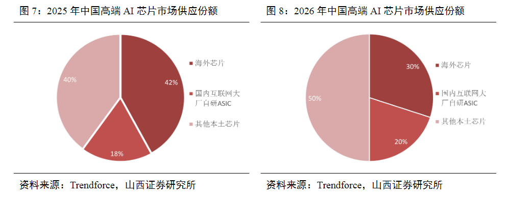 根据 Trendforce 预测,2026 年国产 AI 芯片(包括国内互联网大厂自研的 ASIC 芯片和本土芯片供应商的产品)在国内高端 AI 芯片市场的供应份额将达到 70%,而英伟达 H200、AMD MI325 等同级海外产品的份额仅为 30%。