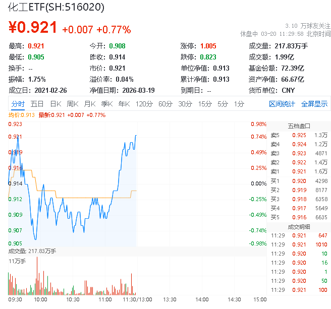 热门ETF方面,华宝基金化工ETF(516020)场内价格上涨0.77%,成交额达1.99亿元。