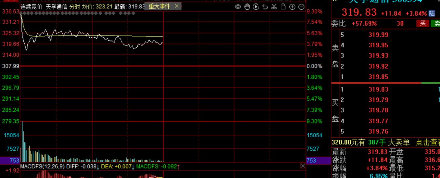 天孚通信早上高开9个点,然后被资金兑现,午盘收涨4个点。目前股价320元,这3个票加起来都14w了,跟茅台也差不多....