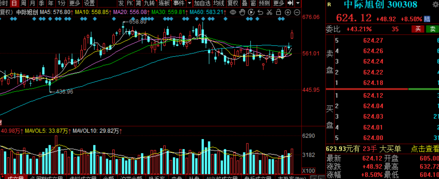 中际旭创今天跳空高开目前股价624,距离前高真的是摸一把的距离。上午成交了254亿,全天奔着400亿的天量了...