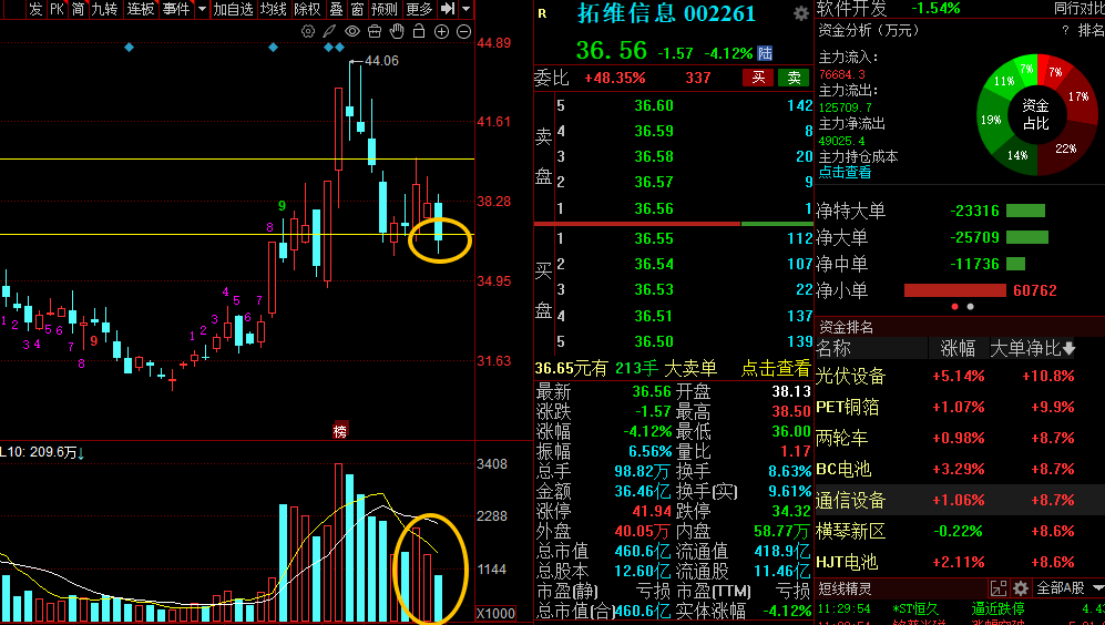 我们之前就讲过,市场现在更认硬件和景气,不太认纯情绪的软件应用。拓维今天这个走势,其实也验证了这个判断。下午如果36.5守不住,就要防进一步走弱;如果能拉回37.5上方,才算稍微缓口气。
