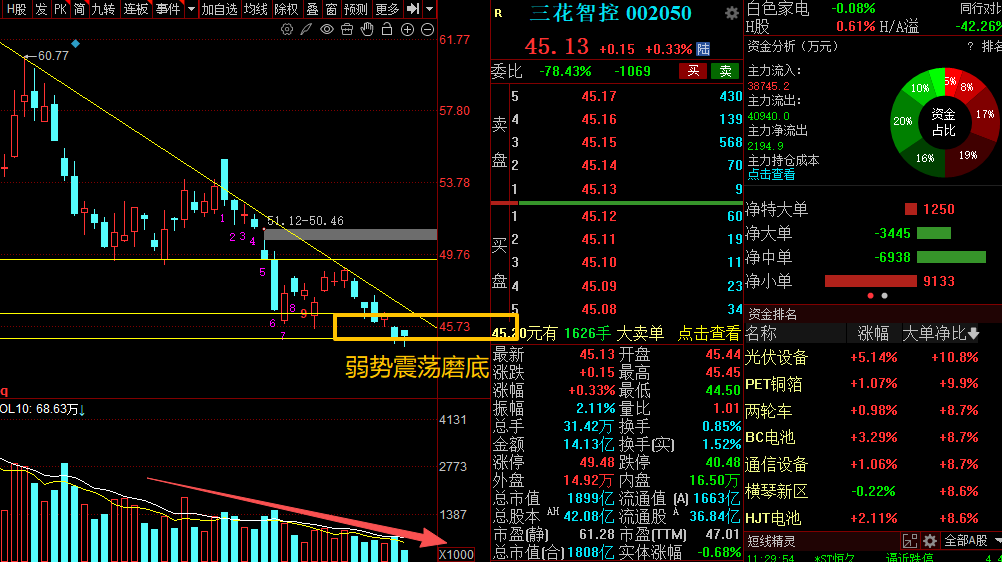 三花现在还是偏弱,属于回落后的低位磨底,量能也不算积极。上午虽然是红的,但强度不够,说明资金更多是修复而不是进攻。