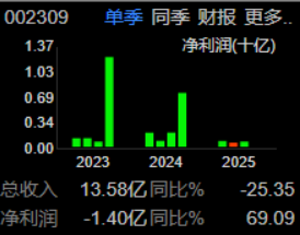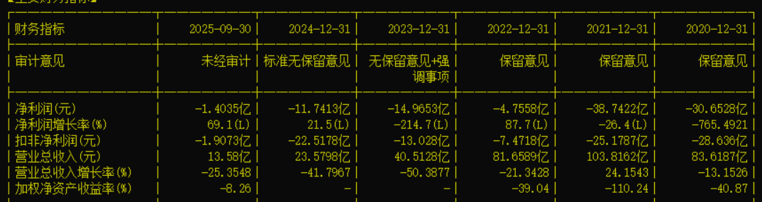 2025年三季报总收入13.58亿,同比-25.35%。净利润-1.4亿,同比+69.09%。