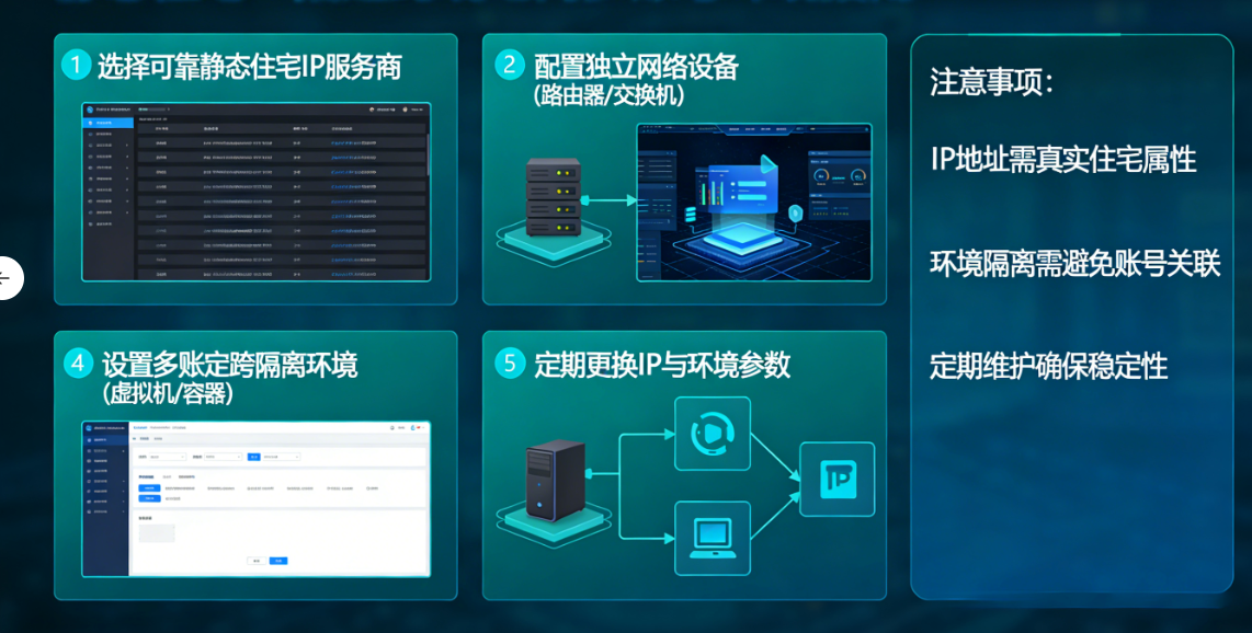 静态住宅IP + 指纹浏览器 + 独立账号资料 + 固定设备环境