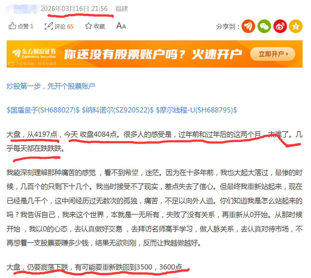 3月20日,今天大盘下跌49点,如前几天所预料的一样,破位4000点,3957收盘。我认为还会再继续下跌,跌到3500点。盘面上4786家下跌,也就是说,外面跌成了深海。在外面做的,有的人今天追进去,当天大跌,第二天大跌,两天就亏十几个点割肉。再这样操作一次,几天就亏了三四十个点。赵姨拿到今天,我仍然有8个点的盈利,最多时已经过了1000个。外面很多票,跌了只能割肉。但是赵姨,不一样,她跌了可以加,可以低吸。所以仓位的管理是很重要的,你没有满仓,下跌时有资金可以加。即使是止损,也比满仓要少亏很多。太多人关注短时间的起伏震荡,多是投机者。当年我做寒武纪,我从几十块做到几百块,赚了十几倍。而那时与我一起的,很多人在震荡中都下车了,坚持不住。