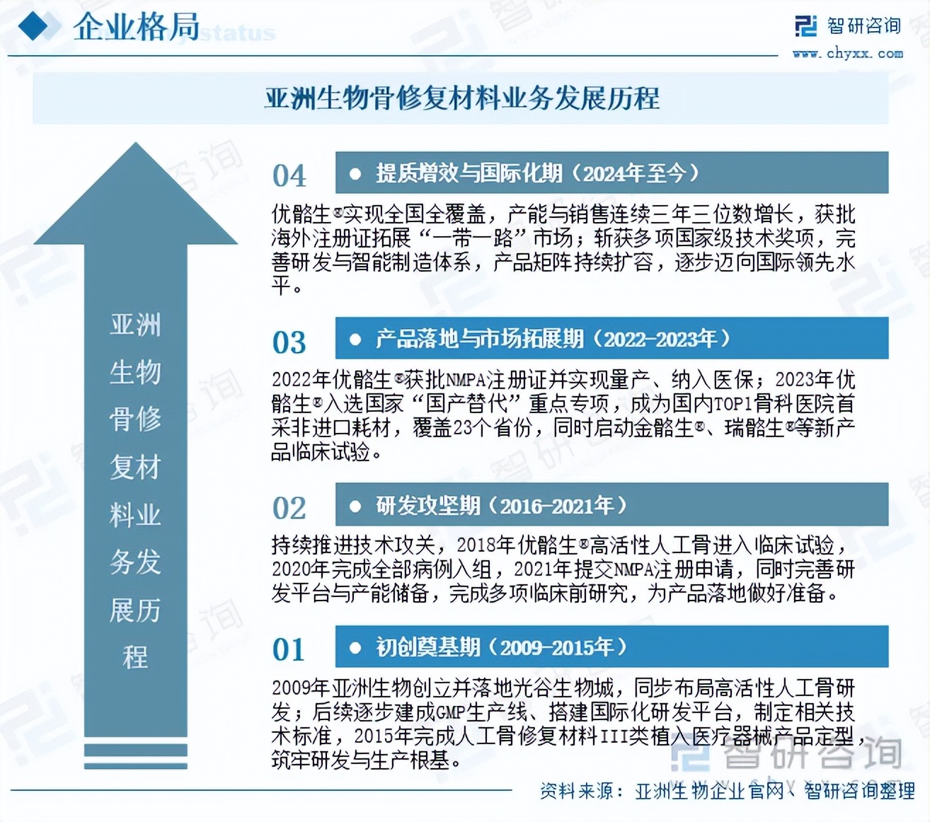 武汉亚洲生物高活性人工骨修复材料的发展始于2009年公司创立,历经十五年深耕,从初创期筑牢研发与生产根基、完成产品定型,到研发攻坚期实现技术突破、推进优骼生临床试验与注册,再到2022年优骼生获批NMPA注册证实现产业化落地并纳入医保,2023年入选国家“国产替代”重点专项、拓展国内市场,2024-2025年实现产能与销售三位数倍速增长,获批海外注册证拓展“一带一路”市场,斩获多项国家级、省级技术奖项,拥有完善产品矩阵与研发平台,逐步实现从技术积累到国产标杆、再到国际接轨的跨越式发展,成为引领行业创新的核心力量。