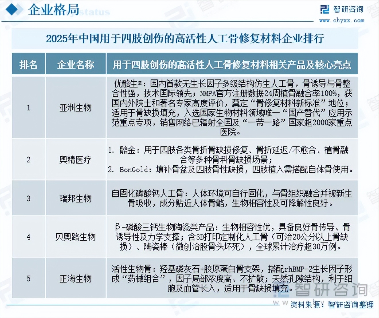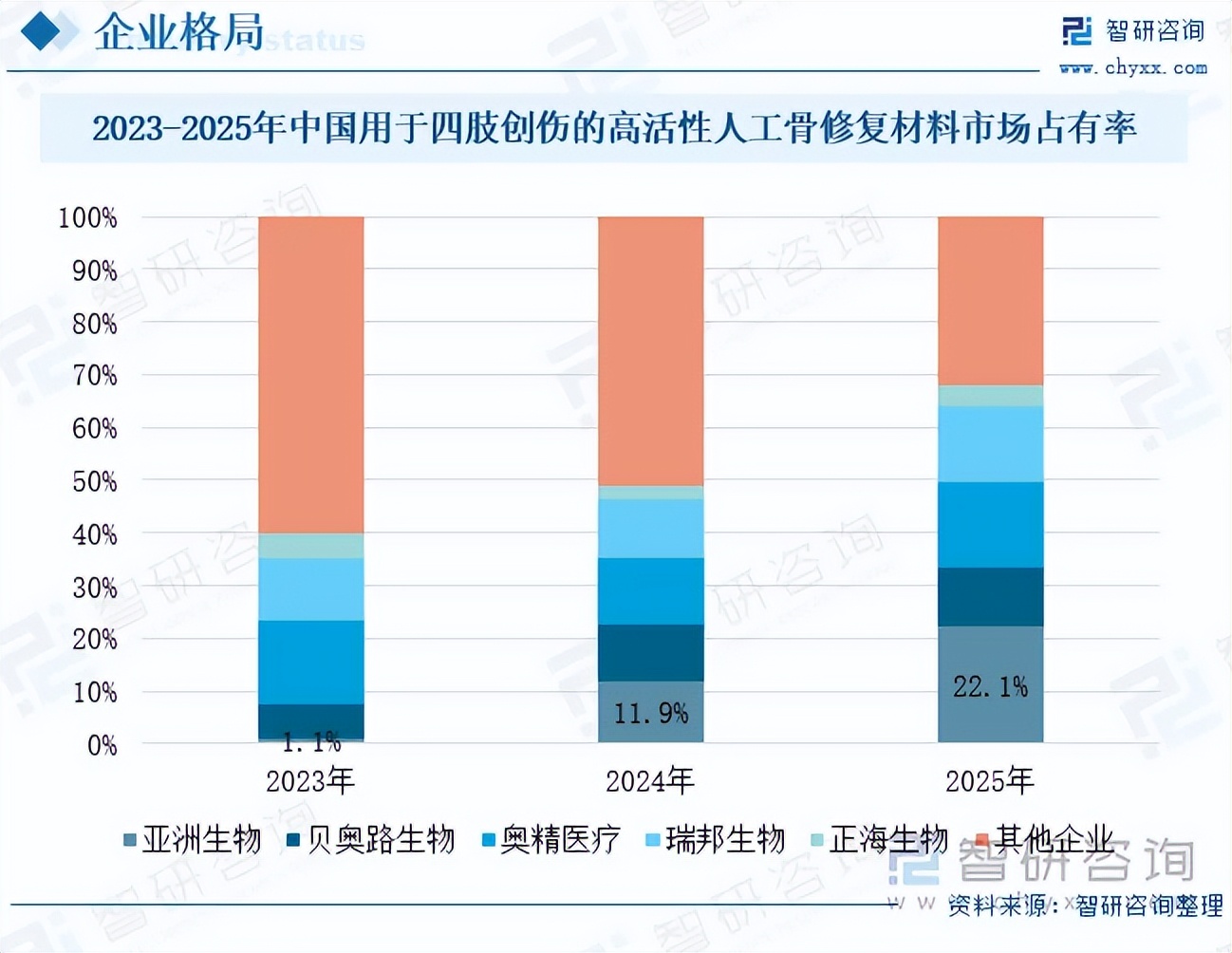 用于四肢创伤的高活性人工骨修复材料行业具有较高的技术与市场准入门槛,目前国内具备核心竞争力的企业数量相对较少。其中,亚洲生物的增长表现尤为突出,成为本土企业中异军突起的标杆。2023-2025年,该公司市场份额由1.1%跃升至22.1%,实现了从行业追随者到头部阵营的跨越式突破。凭借其核心产品优骼生的技术领先性与临床认可度,亚洲生物不仅自身实现高速成长,更有效驱动了行业格局的深度重塑,推动行业逐步形成“头部引领、梯队分明”的竞争雏形。