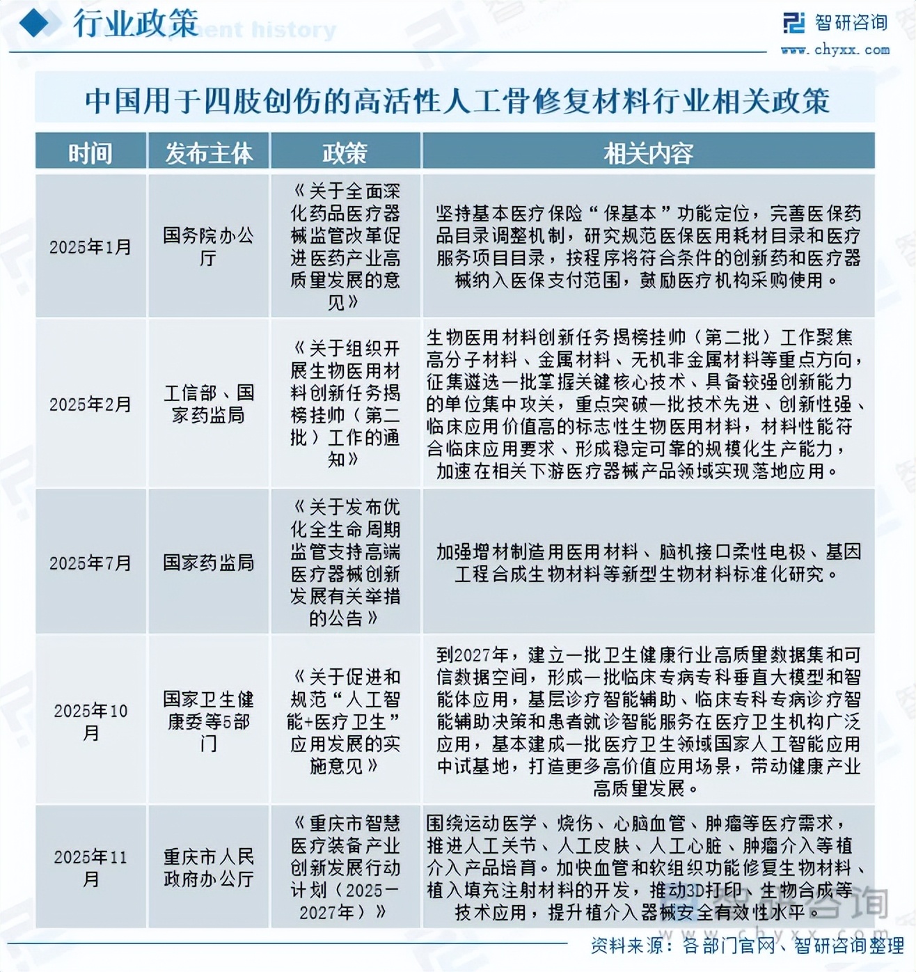 用于四肢创伤的高活性人工骨修复材料是人工骨修复材料中面向临床刚需、技术壁垒高、产业化前景广的关键分支,也是生物材料领域高端植介入器械与再生医学的核心发展方向。近年来,我国陆续出台《关于全面深化药品医疗器械监管改革促进医药产业高质量发展的意见》《关于组织开展生物医用材料创新任务揭榜挂帅(第二批)工作的通知》《关于发布优化全生命周期监管支持高端医疗器械创新发展有关举措的公告》《关于促进和规范“人工智能+医疗卫生”应用发展的实施意见》等一系列政策,从审评审批提速、创新通道优先、核心技术攻关、全生命周期监管、临床转化与医保协同等维度系统发力,为用于四肢创伤的高活性人工骨修复材料的技术突破、产品迭代、临床准入与规模化落地构建了完善的顶层支撑体系。与此同时,地方政府同步跟进、精准配套,如《重庆市智慧医疗装备产业创新发展行动计划(2025—2027年)》围绕运动医学、创伤修复等重点需求,明确培育人工关节、植介入医用耗材,加快功能修复生物材料研发,推动3D打印、生物合成等前沿技术应用,进一步为用于四肢创伤的高活性人工骨修复材料区域产业化、临床场景拓展、产品安全有效性提升提供了坚实的落地保障。
