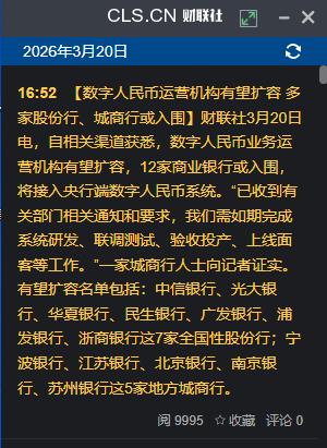 数字人民币运营机构有望扩容 多家股份行、城商行或入围】财联社3月20日电,自相关渠道获悉,数字人民币业务运营机构有望扩容,12家商业银行或入围,将接入央行端数字人民币系统。“已收到有关部门相关通知和要求,我们需如期完成系统研发、联调测试、验收投产、上线面客等工作。”一家城商行人士向记者证实。有望扩容名单包括:中信银行、光大银行、华夏银行、民生银行、广发银行、浦发银行、浙商银行这7家全国性股份行;宁波银行、江苏银行、北京银行、南京银行、苏州银行这5家地方城商行。