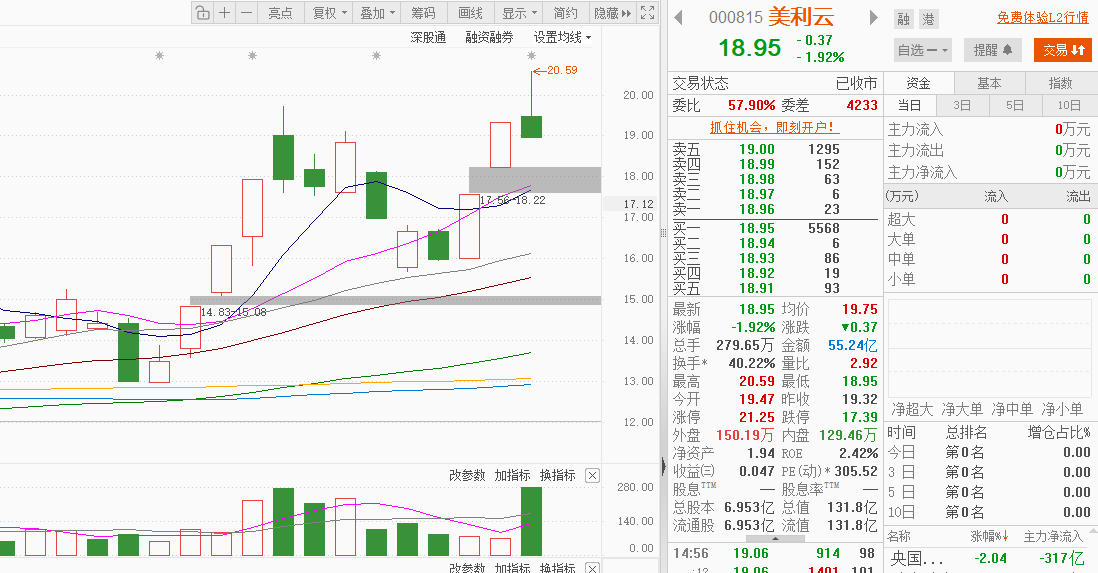 $美利云(SZ000815)$:前期涨幅过大(近三个月涨 73.22%),获利盘丰厚,在市场恐慌期,资金优先兑现美利云这类高弹性标的,分时图呈宽幅震荡态势,早盘冲高回落,午后持续走弱,但未出现系统性风险,算电协同逻辑未变,尾盘在 18.95 元获得支撑,有资金小幅抄底。