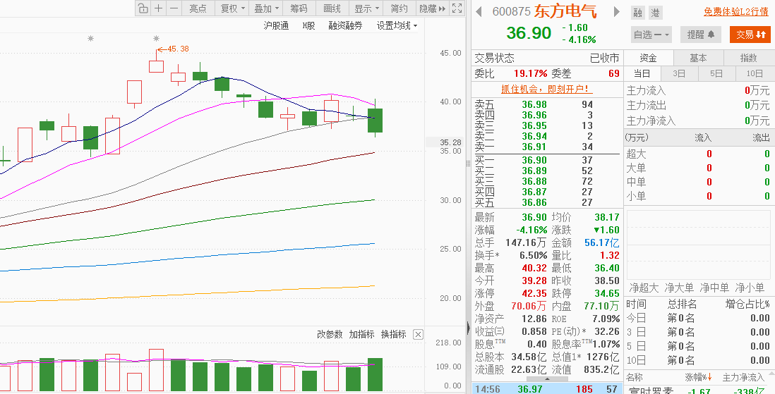 $东方电气(SH600875)$:今日收盘 36.90 元,跌幅 4.16%,主力资金净流出 1.24 亿,36.4 元低点有资金承接,算电协同政策红利持续释放,国家枢纽节点新建数据中心绿电占比须超 80%,东方电气作为绿电 + 算电协同双龙头,长期逻辑未破,今日东方电气作为板块中军,今日是遭被动拖累,分时图呈震荡下行态势,早盘冲高回落,午后持续走弱,尾盘在 36.4 元获得支撑,有资金小幅抄底。