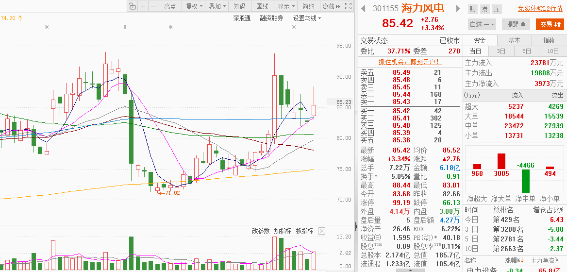 $海力风电$:换手率 5.86%,成交额 6.18 亿。10.85 亿元大额订单托底,海风赛道刚需明确,83 元支撑牢不可破,主力资金暗中吸筹,逆势大涨 3.34%,收盘 85.42 元,今日在大盘跳水集体下跌的情况下,能走成这样足以说明这只标的强势,还是防守83元支撑位,不破则继续持有坚定格局。跟老白同样看法的战友评论扣888。