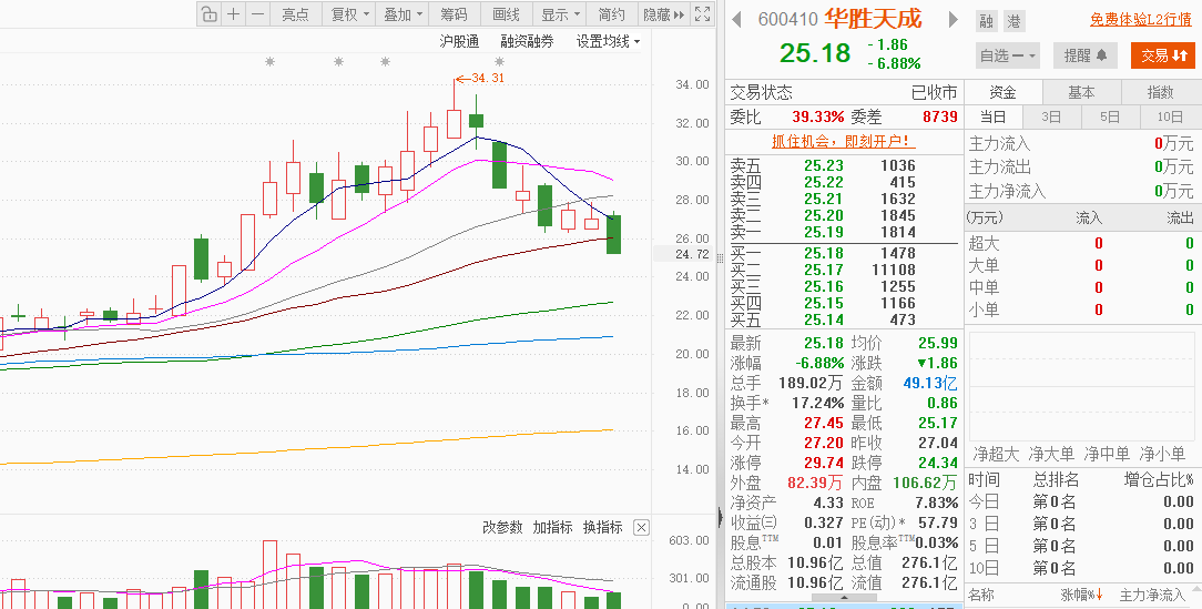 $华胜天成$:作为华为昇腾智算核心总包商,手握 50 亿 + 订单,算电协同逻辑未破,今日回调属于洗盘,今日随算力板块回调,收盘 25.18 元,跌幅 3.21%,换手率 13.8%,主力资金小幅净流出 71.3 万,但未破 25 元核心支撑,若守住,将反抽目标 26.5-27 元,支撑位若失守,将开启调整。