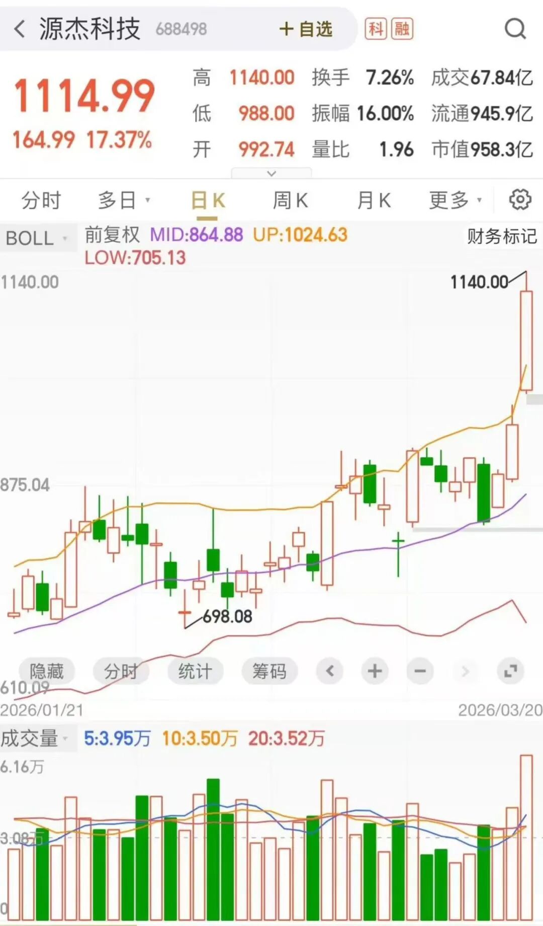 3月20日,源杰科技(688498)盘中涨停,股价最高达1140元/股。截至今天收盘,源杰科技报收1114.99元/股,上涨17.37%,股价超越寒武纪,仅次于贵州茅台,成为A股市场第二高价股。